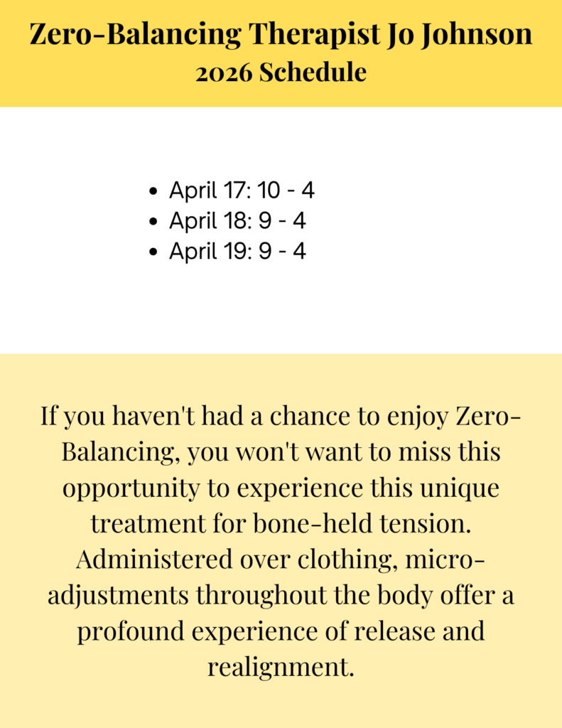If you haven’t had a chance to enjoy Zero-Balancing, you won’t want to miss this opportunity to experience this unique treatment for bone-held tension. Administered over clothing, micro-adjustments throughout the body offer a profound experience of release and realignment.